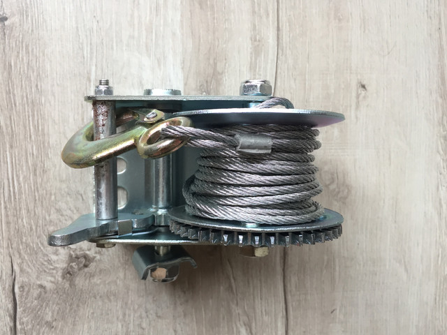 Лебідка з міцною сталевою конструкцією, призначеною для втягування невеликих човнів, мотоциклів, транспортних засобів та інших предметів. Механизм трещотки. Гак із запобіжником.