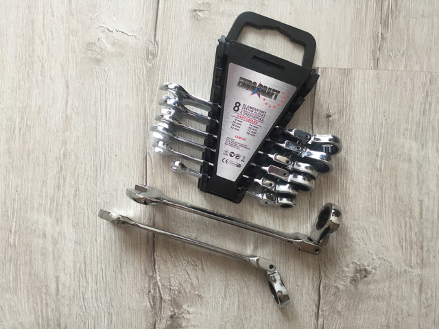 Набір із 8 плоских ключів із храповиком. Дуже потужний механізм зубчастої й шестерні зроблений із загартованої сталі.Закритий механізм стійкий до зношування та пошкоджень. Використання малого розміру та тримача на стику дає змогу маневрувати ключ до 180° у кожному напрямку.Главний рефрижератор обладнаний наконечником поверхневого наконечника, що дає нам можливість відвернути гвинт із ушкодженою головою (випуклий, заокруглений). Всі ключі виготовлені з хромо-ванадієвої сталі.Вмикає пластмасовий органайзер.